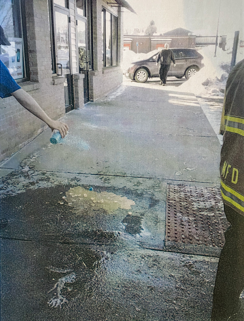 In one such picture, you will see the employee from Dunkin’ Donuts shaking blue salt onto the area where our client slipped. The photograph was taken at the exact moment that the salt was being shaken out of the cup indicating that the sidewalk was not treated previously but was treated after our client was taken from the scene by the EMTs. You will also see, in the photograph, her drink on the ground, as well as the ice cubes, from her ice coffee.
