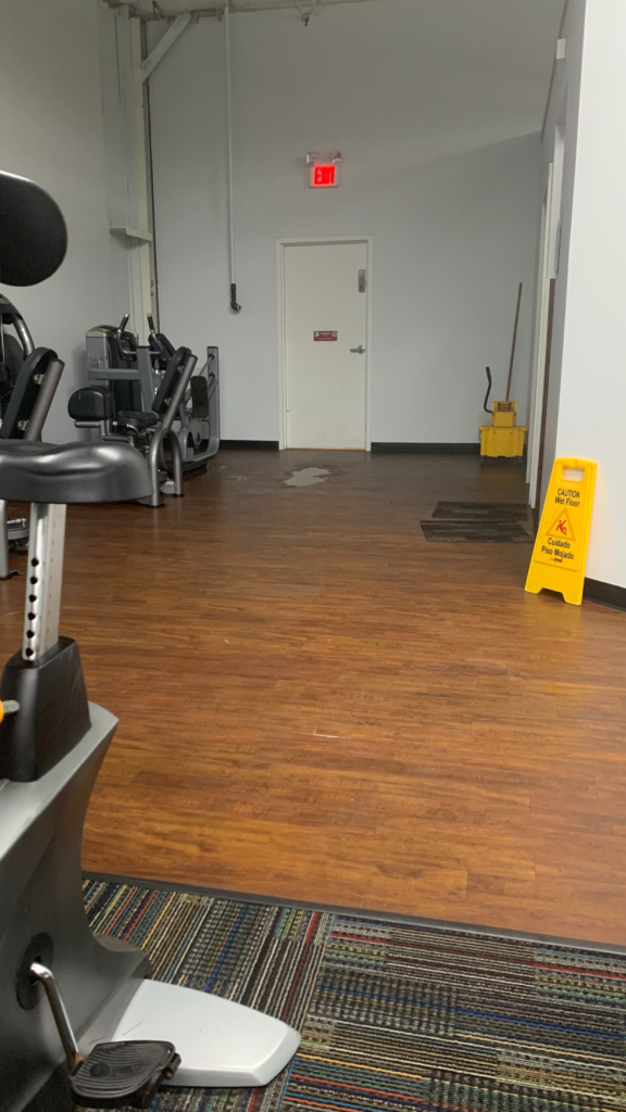 I arrived at my gym early one morning, and as I rounded the hallway corner, I saw a large puddle forming near one of the emergency exits. The ceiling in this location has leaked for years, and during heavy rainfalls, the problem tends to worsen. It has yet to undergo repair. A quick observation of my surroundings showed three areas with standing water, a yellow caution sign, and a mop propped inside a bucket. The sign, along with the cleaning materials, indicated that the condition of the floor was apparent, yet nothing was done to rectify the situation.